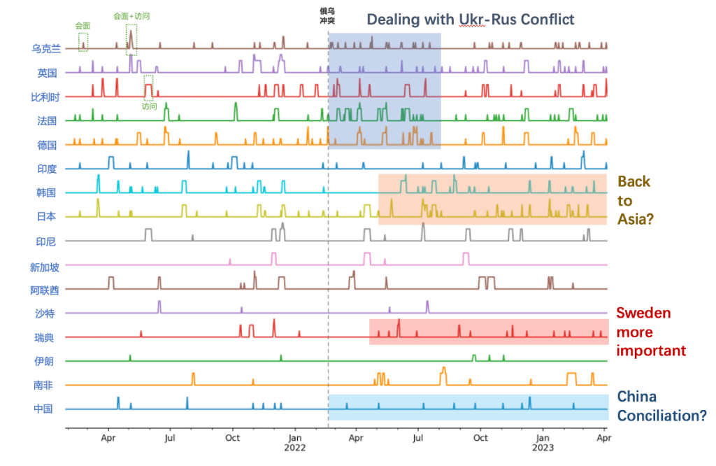 我们的数据库的一大优势在于将各个级别的外交官的活动都囊括了进来,这使得我们可以从相对低级别的外交官活动中获得与未来相关的有价值信息。而以往的研究主要关注“元首外交”。尽管元首访问是外交活动中最为令人瞩目的部分,但它往往是许多前序活动的“后果”,想要了解事件的全貌,我们就需要关注相对低级别的外交官活动的信息,如副国务卿,助理国务卿,特使等等。下面关于俄乌冲突后美国外交官在几个主要国家外交活动的可视化展示就是一个很好例子,展示了特定事件冲击对美国外交活动和资源分配的影响。我们可以看到在事件发生前美国外交基于情报而展开的斡旋,也可以看到事件发生后大量的外交资源投入在欧洲和盟友的反应,还可以看到事件后美国回归其亚太战略的过程。
