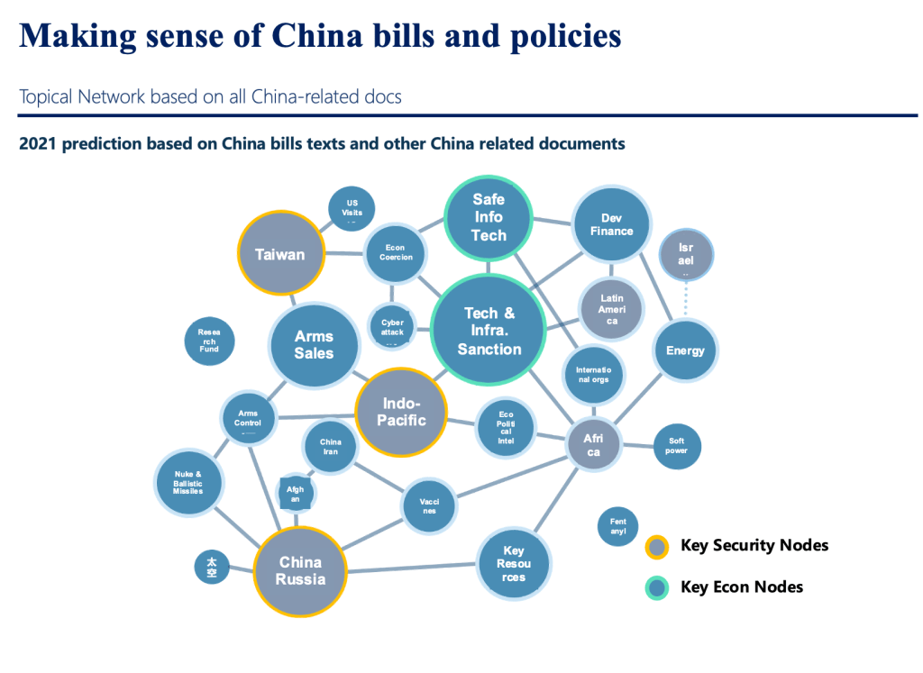 分析立法大数据的作用不仅仅局限于单个立法的预测,我们还可以利用一些数据分析技术来帮助我们理解美国政策的全貌和趋势。例如,我们可以使用包括所有涉及涉华立法和政策的数据进行主题网络分析,以更好地理解美国对华政策的整体情况。下图是我们利用2020年至2021年的数据进行的主题网络分析示例,它显示了美国未来对华政策的核心关注点在于台海、印太地区和中俄合作,而经济政策的核心则集中在技术和设备制裁领域。这一分析结果与我们后来观察到的情况非常吻合。