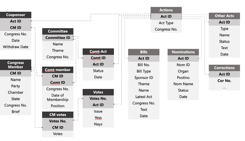 获取数据是进行分析和预测的基础。获取美国立法数据相对容易。在美国国会两院的官方网站上可以找到相关链接,此外,GovInfo网站还提供了近十几年的立法批量数据(bulk data)下载,这些数据包括了各种不同类型的xml格式立法文件。文件中的标签(tag)信息丰富,涵盖了法案文本、提案人(sponsor)、共同提案人(co-sponsor)、负责法案的委员会、不同阶段的投票情况、法案进程(stages/acts)和时间等关键信息。数据下载后,可以利用xml文件中的关键信息建立数据库(例如用下图所示结构),进行更深入的分析。法案文本也可以通过语言处理算法进行进一步的分类和标签提取。根据不同的研究目的,研究者可以设计不同的数据库结构和分析算法。本文将介绍一些分析涉及中国的立法的思路。