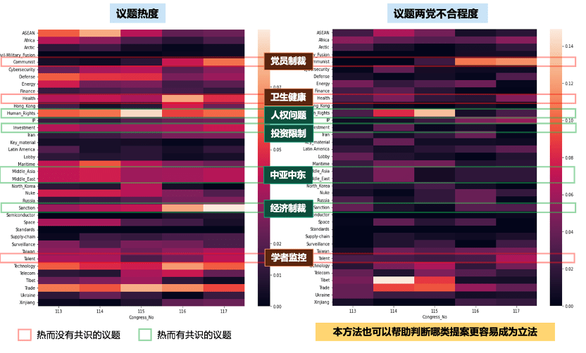 首先,我们将讨论法案主题的热度和两党共识对立法概率的影响,这是一个相对有趣的方面。对于特定领域的立法,国会委员会可能会根据法案主题的热度来决定是否进一步在委员会内部进行讨论。而委员会内部的投票是否能够通过又进一步取决于两党之间的共识,因为通过需要获得大多数委员会成员的支持,包括来自两个党派的支持。热度可以通过特定议题的出现频率来衡量,而两党共识则可以通过投票和党派支持数据的平衡来衡量。下图展示了116-117届国会中涉及涉华议案的不同主题的热度和两党共识情况。图中明亮的部分分别代表了主题的流行度(左侧,颜色越明亮表示越流行)和主题的争议程度(右侧,颜色越明亮表示争议程度较高,缺乏共识)。可以看出,关于限制中国学术人员的法案具有较高的热度(主要受到共和党支持),但缺乏两党之间的共识。而关于限制对华投资的法案既有一定热度又有两党之间的共识。因此,我们可以推断,与限制对华投资相关的法案更有可能通过委员会并最终完成立法。从结果来看,这一推断是完全正确的。