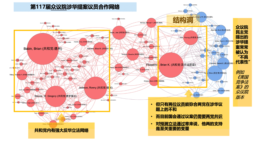 其次,党内和议会内的社会关系也是一个重要的因素。举例来说,如果提案人在国会内有较高的社会地位,那么他们的法案通过的可能性也较高。另一方面,如果在特定议题上两党合作程度较高,那么相关法案通过的概率也会较高。通过分析议员的投票数据和共同支持(cosponsor)数据,我们可以推测议员之间的合作关系,并进一步创建议员合作的邻接矩阵(adjacency matrix),用于构建社交网络图和进行计算。下面的两张图展示了第116届和第117届众议院涉华提案的合作情况。其中最明显的变化是第117届众议院相对于第116届,涉华提案两党合作的减少。这是因为一些关键议员由于退休或其他原因离开国会,导致第117届国会的社交网络出现了“结构洞”(structural hole),即两党之间的联系仅由一两个议员维持。这些变化也在数据中有所反映,涉华提案两党共同支持的比例从第116届国会的44%下降到第117届国会的30%。这也导致了整体涉华提案通过比例的下降。另一个值得注意的推论是,处于社交网络关键位置的议员所提出或支持的议案在所在议会中有更高的通过概率。这个推论也得到了数据的支持。例如,在第117届的结构洞地位中的众议员Brian Fitzpatrick,他提出的涉华议案在众议院通过的概率高达24%,远远高于一般情况下的8.5%。而在众议院中更重要但无法获得两党共识的Brian Babin众议员在同一届的涉华议案通过众议院的概率只有9.8%。